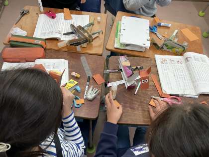2年生の国語です。「馬のおもちゃの作り方」の教材で、説明の仕方に気をつけて読み、分かりやすく説明するためにどんな工夫をしている考えました。そして、文章を読んで実際に馬のおもちゃを作ってみました。