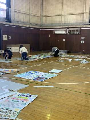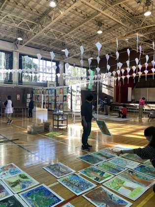 月曜日の放課後、教職員で平面作品の展示を行いました。水曜日には、子どもたちが立体作品を搬入します。体育館が徐々に美術館に変わっていきます。