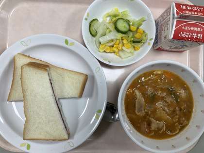 本日の献立 ジャムサンド(ブルーベリー) 牛乳 ハンガリアンシチュー
