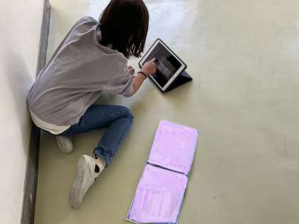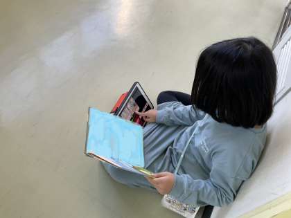 2年生の国語では、絵本の紹介動画の撮影をiMovieを活用して行なっています。静かな環境で録画が必要なので、各々選んだ場所で学びを進めていました。編集作業も行なっています。