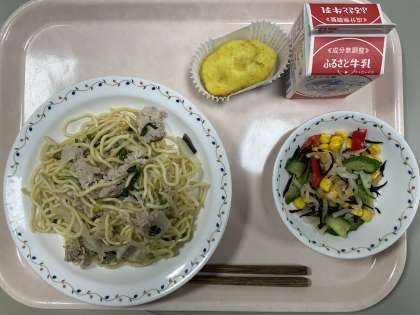 本日の献立 塩焼きそば 牛乳 大根とひじきのサラダ スイートポテト