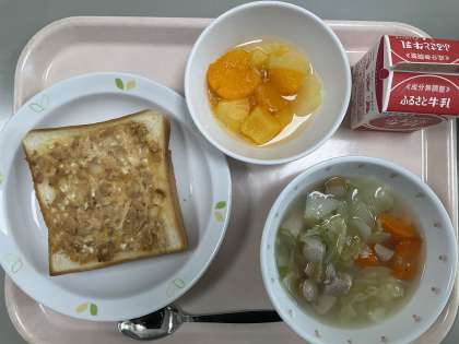本日の献立 ツナトースト 牛乳 ポトフ フルーツポンチ