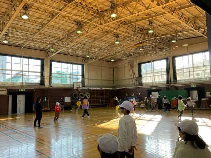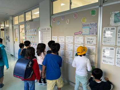 水曜日朝の時間に「つながりタイム」の活動がありました。6年生がリーダーとなり縦割り班ごとに遊びや場所を決めて活動しました。活動内容は、職員室前の廊下に掲示されていて、それを確かめて活動場所に向かう子どもたちもたくさんいます。活動場所は、班によって決まっていて、校庭、体育館、教室、屋上などです。