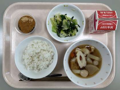 本日の献立 麦ごはん 牛乳 洋風おでん 野菜のごま風味 黒糖寒天