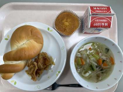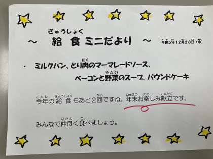 本日の献立 〜年末お楽しみ献立〜 ミルクパン 牛乳 鶏肉のマーマレードソース