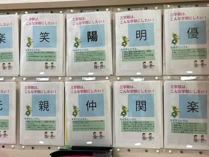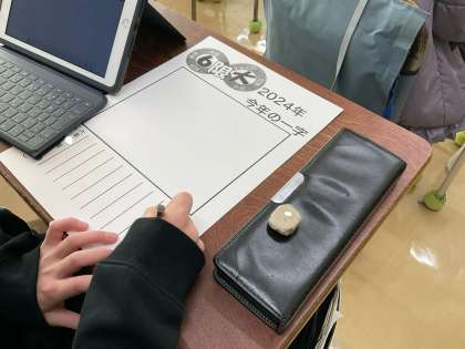 2024年3学期を迎え、なりたい自分を表す漢字を考えました。どうしてその漢字を選んだかの理由を考えることで、なりたい自分の姿がより明確になりました。写真は、上が6年生、下は4年生です。