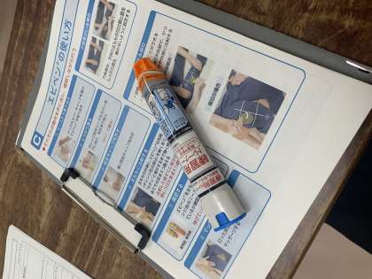 毎学期給食が始まる前に、教職員の食物アレルギー研修を行います。エピペンの使い方の再確認の他、実際を想定したシナリオを用意して、万が一の場合に誰がどのような動きをするかを確認します。今回は、養護教諭が不在の場合を想定して研修を行いました。