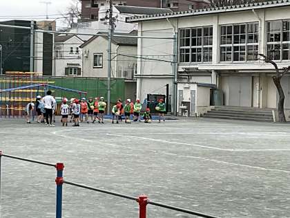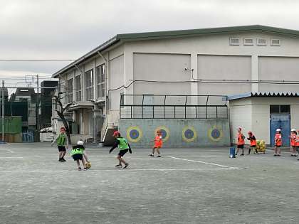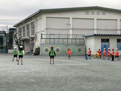 3年生の校庭体育では、キックベースの学習をしています。今日は、守るときに意識することを考えて初めてのゲームをしました。