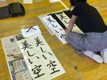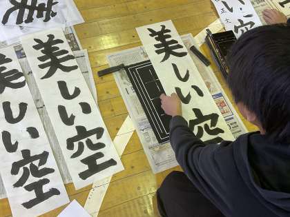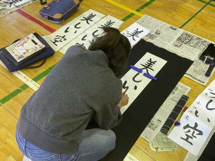 4年生は、13日土曜日に書き初めを体育館で行いました。お手本をよく見て、力強く書き上げました。