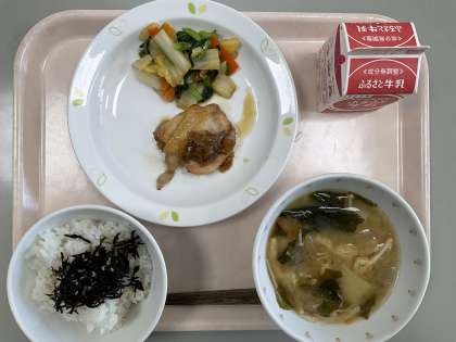 本日の献立 麦ごはん 牛乳 ひじきのふりかけ 鶏肉の南蛮焼き おひたし みそ汁