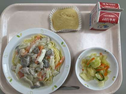 本日の献立 スパゲッティクリームソース 牛乳 野菜のレモンじょうゆかけ