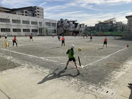 5年生の外体育です。チームで作戦を立てゲームを行い、作戦成功に向けて課題を見つけながら取り組んでいます。今後は「駒繋カップ」の下、ゲームを進めていきます。