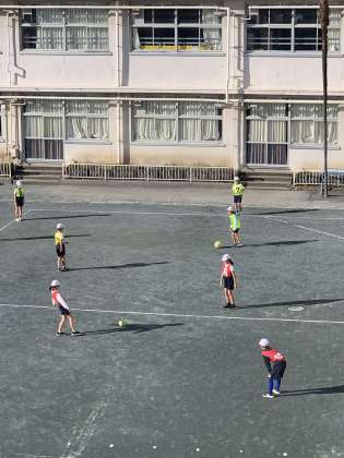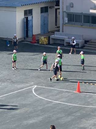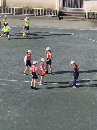 4年生の外体育ではミニサッカーに取り組んでいます。チームに分かれてまずは作戦を相談したり、練習したり。その後にミニゲームを行いました。ミニゲームをして振り返り、次のゲームに生かすための話し合いも積みながら取り組んでいます。写真はミニゲーム前の練習の様子です。