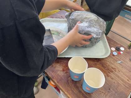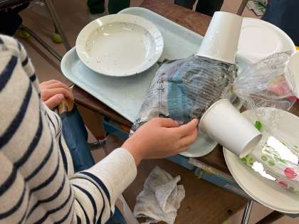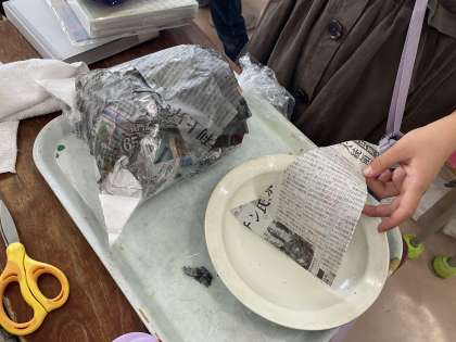2年生の図工では、お面づくりをしています。今日は土台をつくり、目、耳、鼻、口などをテープでつけました。そして三角に切った新聞紙を水で溶いた糊で貼っていきます。さて、思い思いにイメージを広げてどのようなお面になるでしょう。出来上がりが楽しみです。