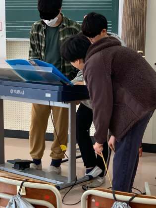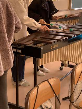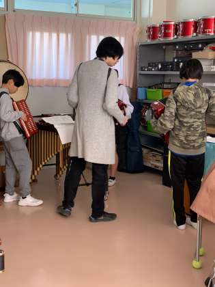 「みんながみんな英雄」の合奏をつくりあげるために、それぞれが希望した楽器の練習を積んでいます。友達と教え合ったり、タブレットで曲を確かめたりしながら進めています。