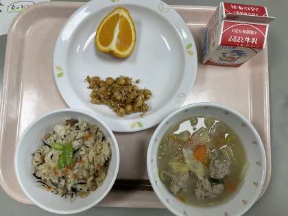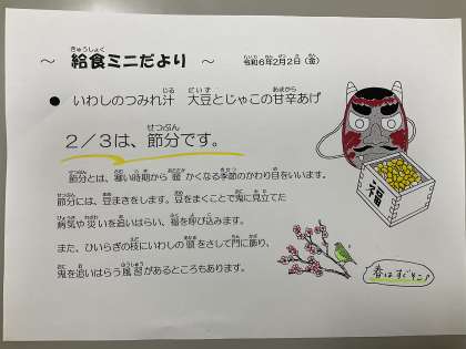 本日の献立 〜節分献立〜磯おこわ 牛乳 いわしのつみれ汁 大豆とじゃこの甘辛あげ