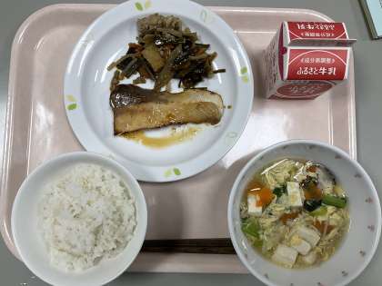 本日の献立 麦ごはん 牛乳 魚の照り焼き くきわかめの炒め煮