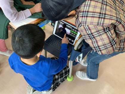 1年生の子どもたちもグリーンバックを用いて動画編集をしています。動画作りをする中で、友達と協働的に学び、読みが確かになっています。