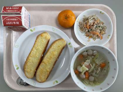 本日の献立 ガーリックトースト 牛乳 ポトフ もやしとツナのサラダ ぽんかん