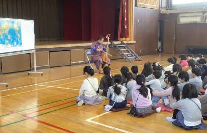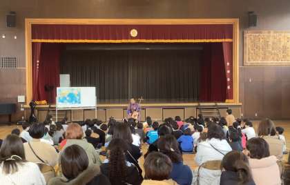 2年生の国語の教材に「スーホの白い馬」があります。そのお話に出てくる「馬頭琴」。今日は講師をお招きして、馬頭琴の演奏を聴きました。学校公開中だったので、保護者の方にも鑑賞していただきました。