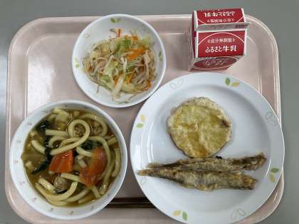本日の献立 カレーうどん 牛乳 天ぷら(ししゃも・さつまいも)野菜のごま風味
