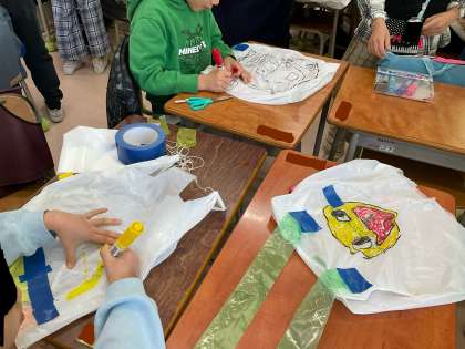 1年生の生活科で、レジ袋を活用して凧をつくりました。思い思いのイラストを描いたオリジナル作品です。早速、屋上で凧上げを楽しみました。