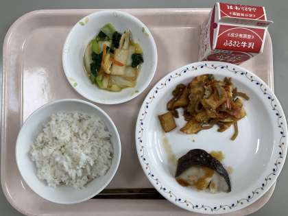 本日の献立 麦ごはん 牛乳 魚のバーベキューソース おひたし きんぴら煮