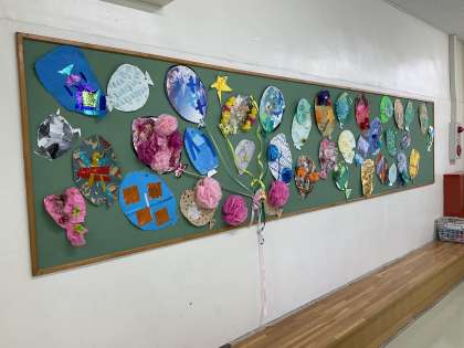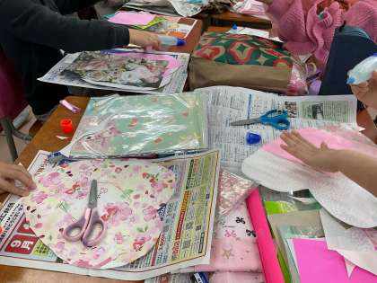 2年生の図工では、お世話になった6年生の卒業を祝って飾る飾りつくりをしています。風船をモチーフにすてきな飾りが出来上がってきています。