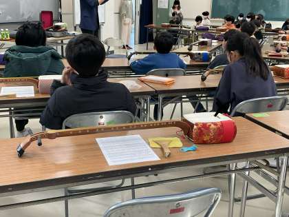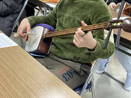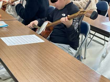5年生の音楽では、今藤長龍郎先生をお招きし、伝統芸能「歌舞伎」の伴奏音楽である長唄三味線の体験をしました。三味線の演奏体験を通して、日本古来の楽器の音色や響きに親しみ、その良さを味わうことができました。