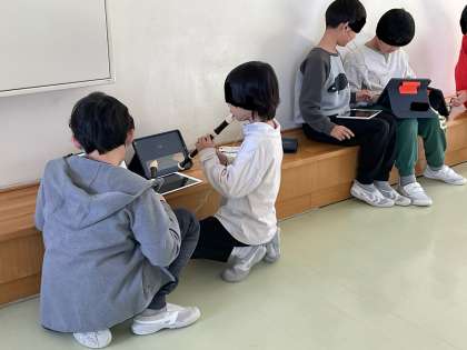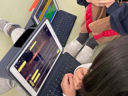 3年生の音楽では、京都府の祇園囃子、青森県のねぶた囃子、東京都の神田囃子を鑑賞し、それぞれのお祭りの特徴をまとめました。日本のお囃子に使われる音階の音(ラ・ド・レ)を使って旋律をつくり友達と共有したあと、つなげ方を工夫して演奏しました。そして、鑑賞したお祭りに自分たちの旋律をつかって参加するとしたらと想定し、GarageBandを使ってその地域を知る人に聴いてもらうための音楽や出し物を創作しています。