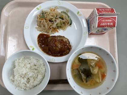 本日の献立 麦ごはん 牛乳 ハンバーグ こんにゃくサラダ みそ汁