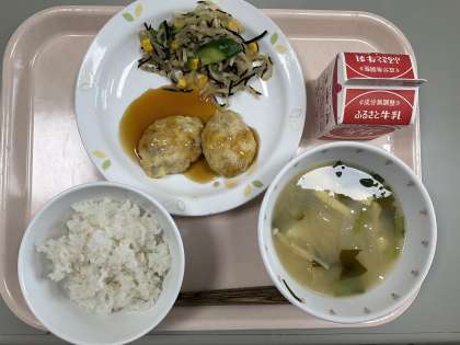 本日の献立 麦ごはん 牛乳 豆腐入りさくさくつくね 大根とひじきのサラダ みそ汁