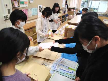 体育館ではいす並べなどの会場準備、1年生の教室では名札をつけたり教科書を机の上に置いたり、図工室では配布物をまとめる、理科室からは各学年の新しい教科書を教室に運ぶ、などなど、たくさんのお仕事を分担してくれました。