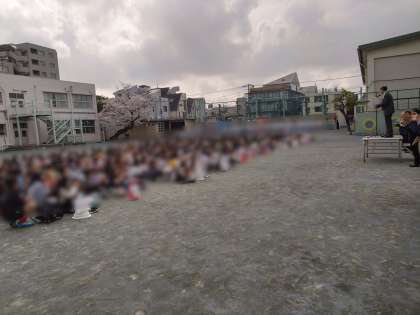 満開の桜が見守る中、校庭で始業式を行うことができました。