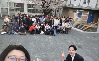 桜の下で、みんなで記念撮影。素敵な笑顔です。