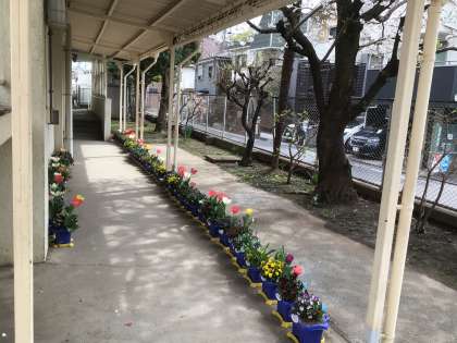 入学式当日は、心を込めて世話をしてきたビオラとチューリップが花の道になりました。体育館に入場してきた「すてきな1年生」を、お祝いの動画で迎えました。