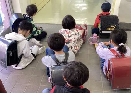 朝、登校してくると、2年生は、クラスごとに列になり、座ってチャイムを待っています。列の先頭の目印だったカラーコーンがなくても、自分たちで声を掛け合って並んでいます。これからの1年間、2年生全員で、よいクラス・よい学年をつくっていきます。