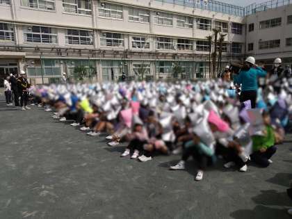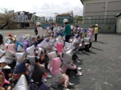 入学から1週間の1年生も、防災頭巾を被り、一生懸命避難しました。