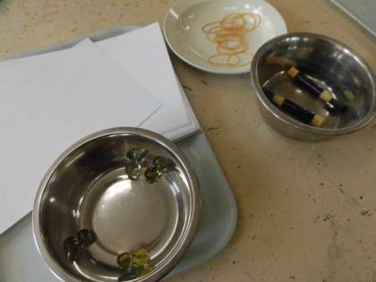 ひも、輪ゴム、波段ボール、ぼかし網、ビー玉・・・。