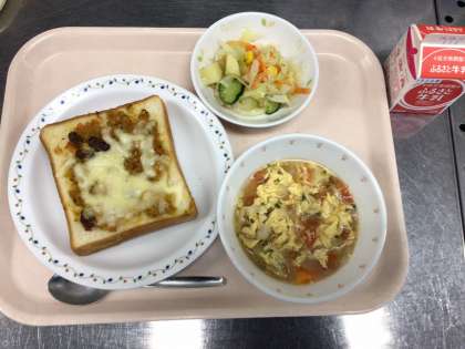 本日の献立 ドライカレーチーズトースト 牛乳 卵とトマトのスープ ポテト入りフレンチサラダ
