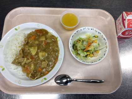 本日の献立 カレーライス 牛乳 コーン入りフレンチサラダ フルーツゼリー
