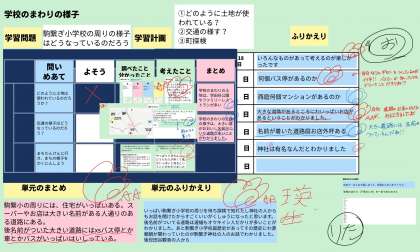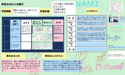 3年 社会「学校のまわりの様子」では、駒繋小学校のまわりの様子について学習しています。「土地の使われ方」「交通の様子」の二つの視点で調べたことをもとに、友達と話し合いまとめました。細かく調べるときは「ありの目(具体的に)」、細かく調べたことをまとめたり、関連付けたりするときは「たかの目(抽象的に)」で見るといいよと伝えています。初めての社会科の学習の進め方も分かってきているようです。