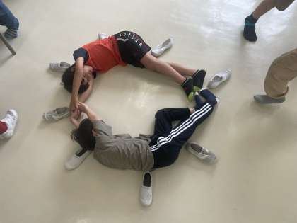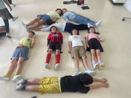 3年の社会の学習では、地図記号について学習します。地図記号を見せると、「こんな記号があるんだ。」「この記号見たことあるよ。」と、友達に伝え合っていました。その後、班で協力して体を使って、地図記号を表しました。
