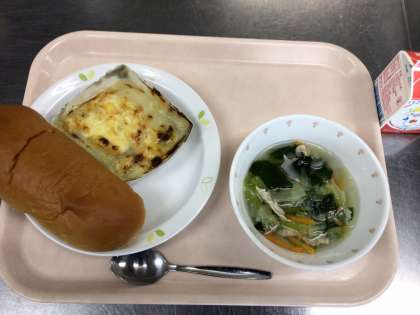 本日の献立 黒砂糖パン 牛乳 ポテトグラタン 野菜スープ