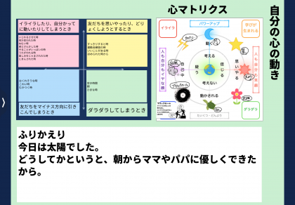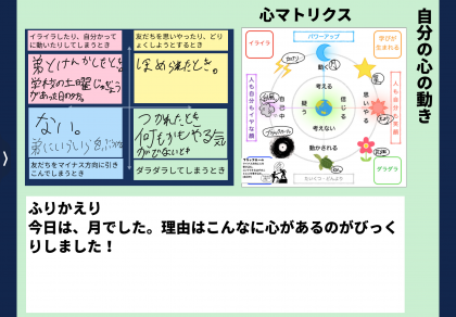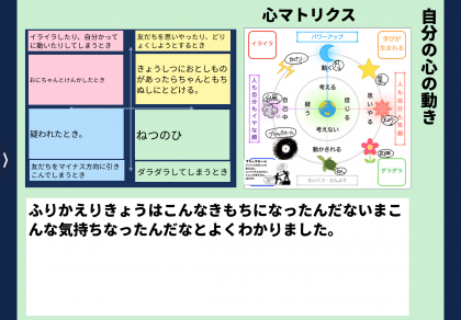 「心マトリクス」を使って、自分の心の動きについて考えました。「友達と喧嘩したらイライラするからカミナリだ。」「朝起きたあとは、ダラダラしたくなるから花畑になりやすい。」「運動会の練習の時は、みんなと協力して頑張ろうってなるから星だ。」と、マトリクス図と照らし合わせて自分を俯瞰して見ることができました。