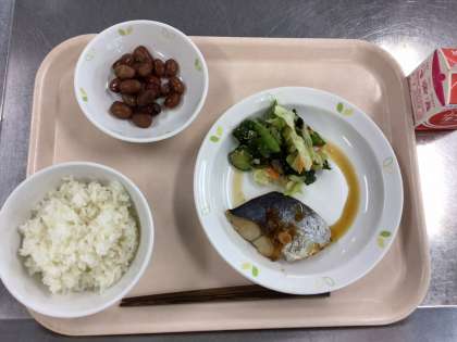 本日の献立 ごはん 牛乳 魚のしょうが風味焼き 春野菜とわかめのサラダ 煮豆