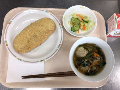 本日の献立 あげパン 牛乳 肉だんご入り春雨スープ 野菜のドレッシングかけ
