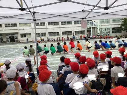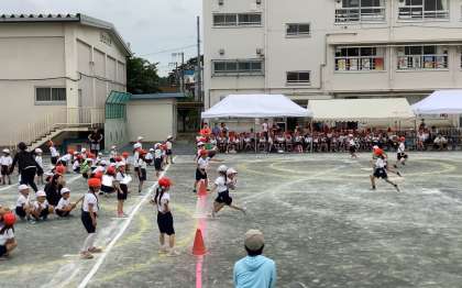 1年生にとって、はじめての運動会でした。1枚目の写真は、折り返しリレーの様子です。次の人に輪バトンを確実に渡そうと、一生懸命走っています。