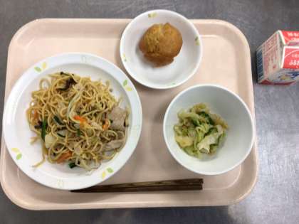 本日の献立 塩焼きそば 牛乳 きゅうりとキャベツの中華味 サーターアンダーギー