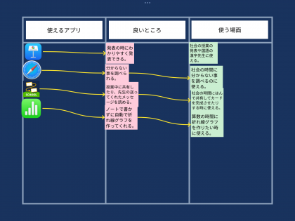 「社会のまとめでポスターが作れる」「理科の記録をとるときに、写真を撮っている」などそのアプリが適した場面を見つめ直し、これから高めていきたいスキルの見通しをもちました。